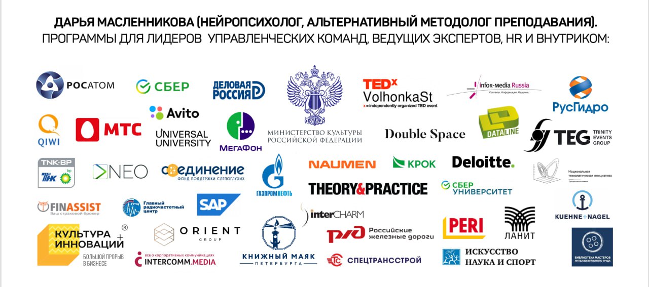 2014 - наст.;Обучение и консалтинг;[Nasamomdele.pro];Консалтинг по морфологии развивающих сред, методология учебных программ, Школа смыслового качества деловой коммуникации SENSE QUALITY и Лаборатория нетривиальных решений [NASAMOMDELE.PRO]. Индивидуальное консультирование топ-менеджеров по темам «человеческий фактор в организации» и «Смыслы от первого лица»